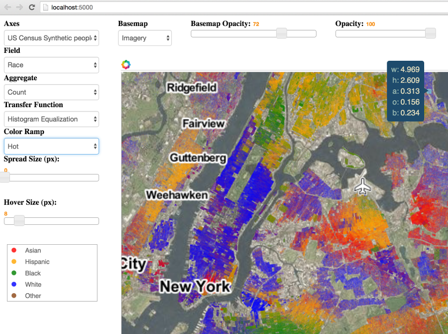 By default, Bokeh copies datapoints from Python into a JavaScript process running in your browser to provide responsive, locally interactive plots. However, browsers can only handle limited amounts of data, making it infeasible to plot millions or billions of points directly in JavaScript. Moreover, typical plot-rendering techniques produce misleading plots for such large datasets, because of overplotting and related issues.