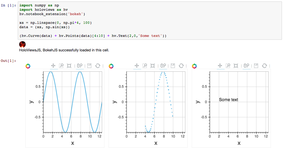 HoloViews is a concise declarative interface that helps you build Bokeh plots. It is a separately maintained package that focuses on interaction with Jupyter notebooks and enables quick prototyping of figures for data analysis. For instance, building an interactive figure with three linked Bokeh plots requires only one line of code in HoloViews.